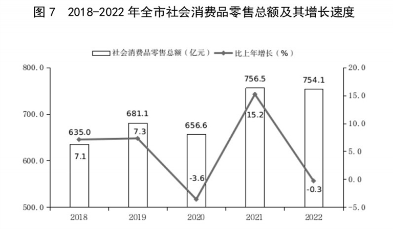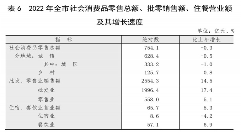 全年全市社会消费品零售总额754.1亿元,比上年下降0.3%。按经营地统计,城镇消费品零售额628.4亿元,下降0.5%;乡村消费品零售额125.7亿元,增长0.8%。按消费形态统计,商品零售额676.6亿元,下降0.6 %;餐饮收入额77.5亿元,增长2.1%。