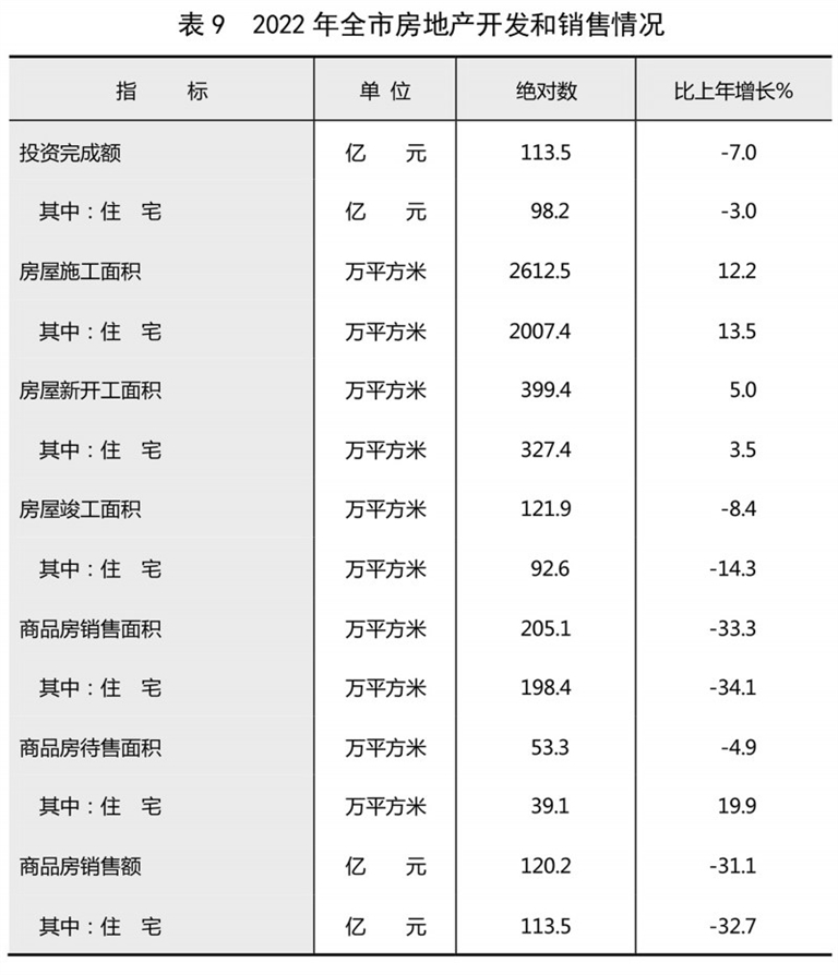 全年全市房地产开发投资113.5亿元,比上年下降7.0%。其中,住宅投资98.2亿元,下降3.0%;商业营业用房投资5.0亿元,下降56.3%。