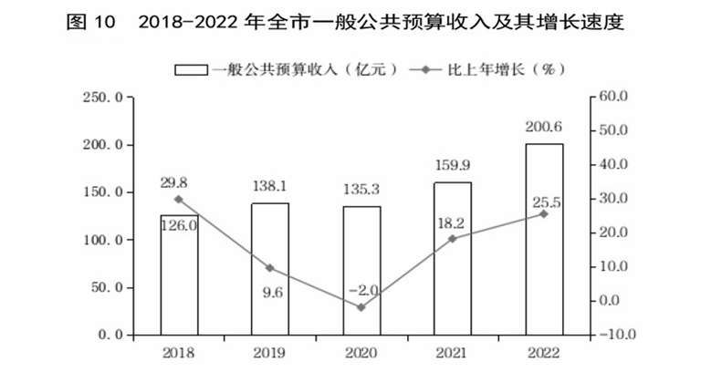 全年全市一般公共预算收入200.6亿元,比上年增长25.5%。其中,税收收入162.1亿元,增长39.7%,占一般公共预算收入的比重80.8%。全年新增减税降费及退税缓税缓费39.3亿元。