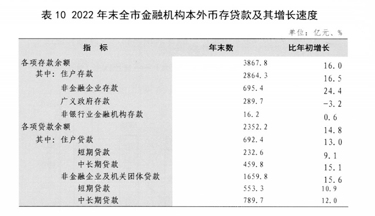 年末全市金融机构本外币各项存款余额3867.8亿元,比年初增加534.2亿元、增长16.0%。各项贷款余额2352.2亿元,比年初增加303.9亿元、增长14.8%。