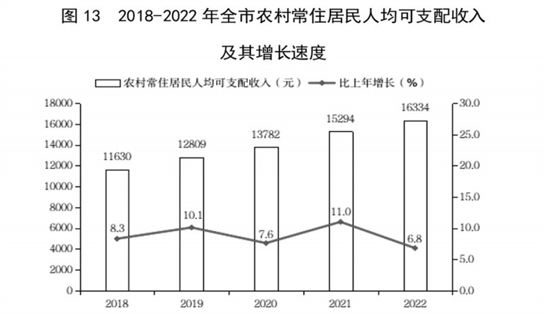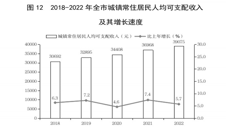 全年全市居民人均可支配收入27375元,比上年增长6.5%。其中,城镇常住居民人均可支配收入39075元,增长5.7%;农村常住居民人均可支配收入16334元,增长6.8%。居民人均消费支出14042元,比上年增长1.6%。其中,城镇居民人均消费支出17783元,下降0.9%;农村居民人均消费支出11994元,增长6.2%。