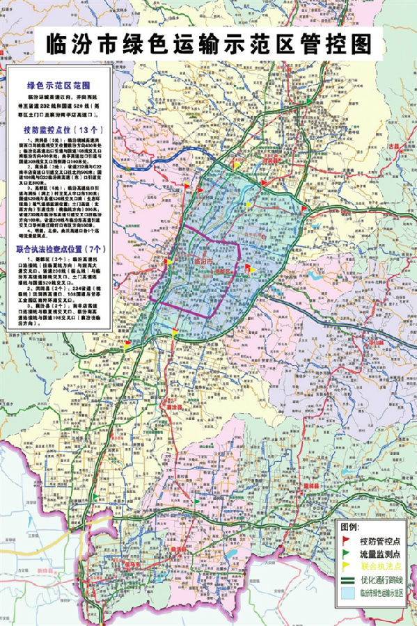 (二)联合执法检查点。尧都区、洪洞县、襄汾县政府要按照属地管辖原则,在路面电子监控抓拍系统的基础上,设置联合执法检查点,对未办理《临时通行证》的重、中型柴油货车、燃气货车和散装物料运输车进行劝导,对擅自驶入绿色运输示范区的重、中型柴油货车、燃气货车和散装物料运输车进行处罚。联合执法检查点具体位置如下: