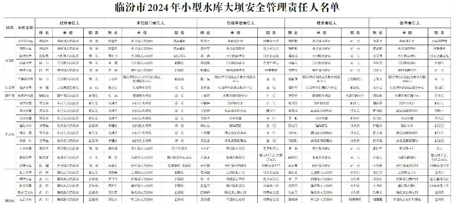 根据《水库大坝安全管理条例》,按照《山西省人民政府办公厅关于加强水库安全管理工作的意见》(晋政办发﹝2023﹞59号)要求,现将2024年全市58座中小型水库大坝安全管理责任人名单予以公布。凡公示后责任人工作变动,其继任者即为新的安全管理责任人。 县级水行政主管部门要会同水库主管部门加强本行政区域内水库大坝安全监管,督促管理单位和管理人员做好各项安全管理工作,切实保障水库安全运行和效益发挥。
