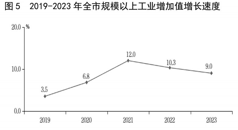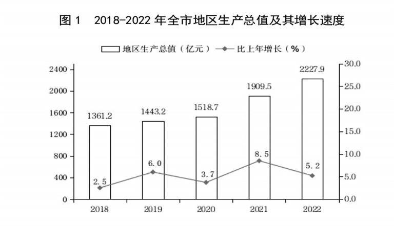 初步核算,全年全市地区生产总值2312.5亿元,按不变价格计算,比上年增长7.6%。其中,第一产业增加值178.0亿元,比上年增长5.2%,占生产总值的比重为7.7%;第二产业增加值1232.5亿元,增长8.1%,占生产总值的比重为53.3%;第三产业增加值902.0亿元,增长7.5%,占生产总值的比重为39.0%。人均地区生产总值59342元,按2023年平均汇率计算为8421美元。