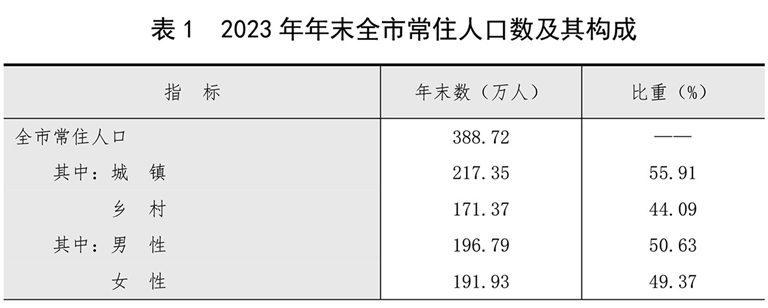 年末全市常住人口388.72万人,比上年末减少1.94万人。其中,城镇常住人口217.35万人,占常住人口比重为55.91%,比上年末提高1.13个百分点。全年全市出生人口2.26万人,出生率为5.79‰;死亡人口3.42万人,死亡率为8.79‰;自然增长率为-2.99‰。