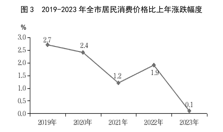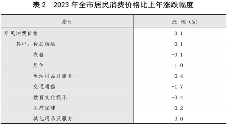 全市居民消费价格比上年上涨0.1%,其中,食品类价格下降0.5%,非食品类价格上涨0.2%。