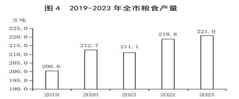 全年全市粮食产量221.00万吨,比上年增产1.0%。其中,夏粮86.50万吨,增产0.1%;秋粮134.50万吨,增产1.6%。