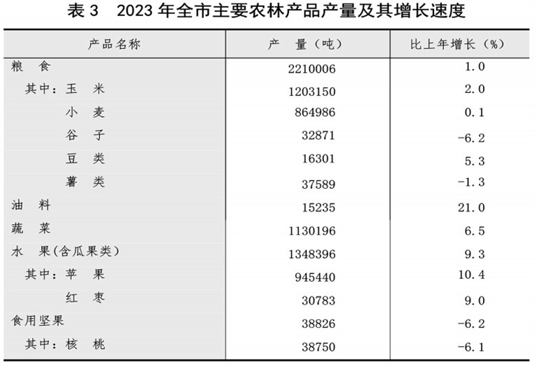 全年全市农作物种植面积550.96千公顷,比上年增加4.38千公顷,增长0.8%。其中,粮食种植面积505.65千公顷,增加1.16千公顷;油料种植面积7.07千公顷,增加0.95千公顷;蔬菜种植面积21.22千公顷,增加0.72千公顷。在粮食种植面积中,玉米种植面积259.56千公顷,增加3.84千公顷;小麦种植面积198.57千公顷,减少1.85千公顷。果园种植面积63.69千公顷,增加0.23千公顷。