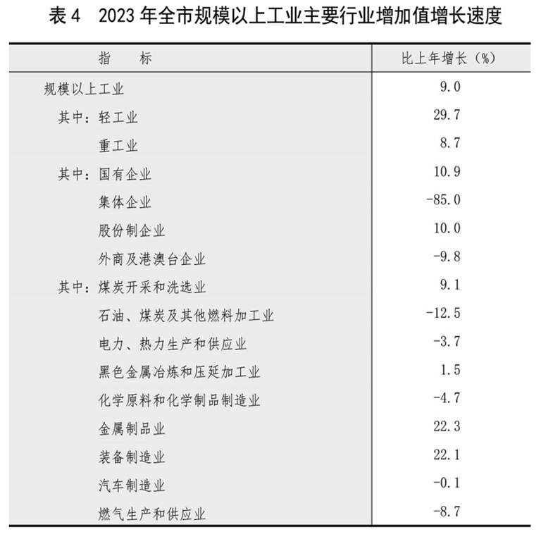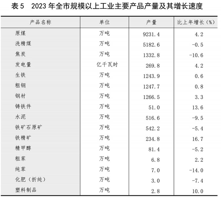 年末全市规模以上工业企业717家。全年全市规模以上工业增加值比上年增长9.0%。分门类看,采矿业增长10.2%,制造业增长6.3%,电力、热力、燃气及水生产和供应业下降4.6%;分煤与非煤看,煤炭工业增长9.1%,非煤工业增长8.7%。