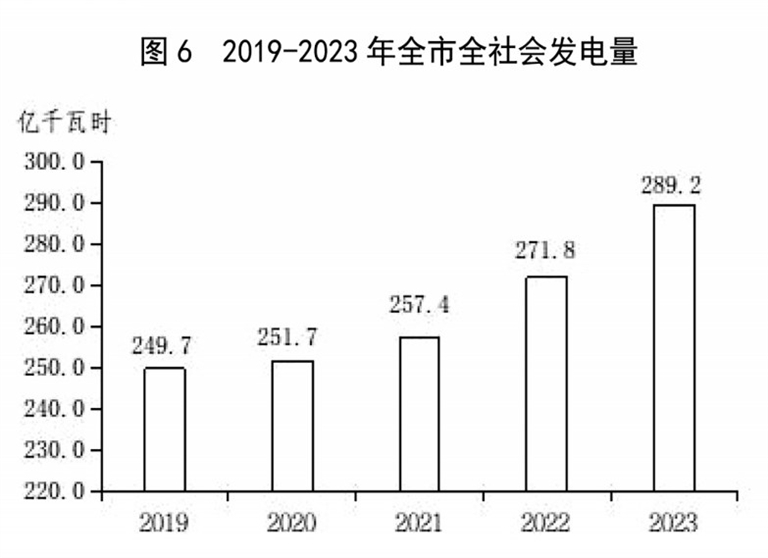 全年全市全社会发电量为289.2亿千瓦时,比上年增长6.4%。全年全市全社会用电总量271.4亿千瓦时,其中,第一产业用电2.7亿千瓦时,占全部用电量的1.0%;第二产业用电190.6亿千瓦时,占全部用电量的70.2%,其中,工业用电188.5亿千瓦时;第三产业用电41.2亿千瓦时,占全部用电量的15.2%;城乡居民用电36.9亿千瓦时,占全部用电量的13.6%。