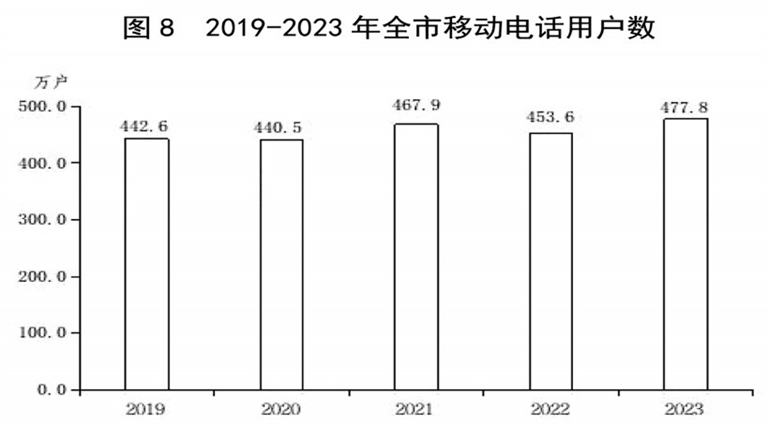 全年全市完成邮政业务总量12.2亿元,比上年增长23.3%;电信业务总量37.0亿元,增长11.4%。年末移动电话基站数3.0万个,其中4G基站1.8万个,5G基站0.9万个。年末移动电话用户477.8万户,其中,5G移动电话用户292.3万户。全市宽带接入用户762.6万户,增长8.3%。