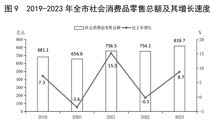 全年全市社会消费品零售总额819.7亿元,比上年增长8.7%。按经营地统计,城镇消费品零售额678.9亿元,增长8.3%;乡村消费品零售额140.8亿元,增长10.9%。按消费形态统计,商品零售额721.7亿元,增长8.0%;餐饮收入额98.0亿元,增长13.8%。