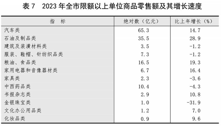 全年全市限额以上单位消费品零售额194.0亿元,增长13.6%。其中,粮油、食品类增长19.3%,汽车类增长14.7%。
