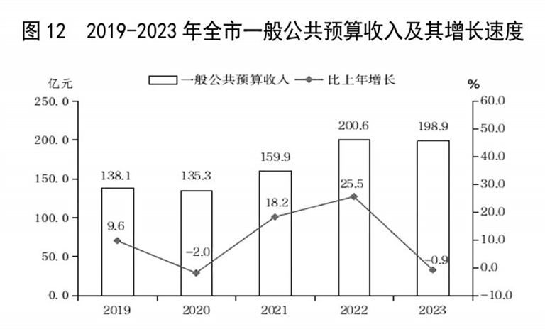 全年全市一般公共预算收入198.9亿元,比上年下降0.9%。其中,税收收入144.1亿元,下降11.2%,占一般公共预算收入的比重72.4%。全年新增减税降费及退税缓税缓费32.1亿元。
