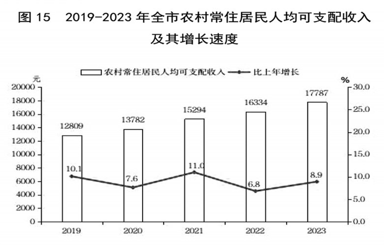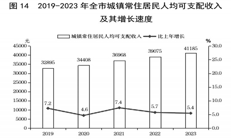 全年全市居民人均可支配收入29261元,比上年增长6.9%。按常住地分,城镇常住居民人均可支配收入41185元,增长5.4%;农村常住居民人均可支配收入17787元,增长8.9%。全市城乡人均居民收入比值2.32,比上年缩小0.07。