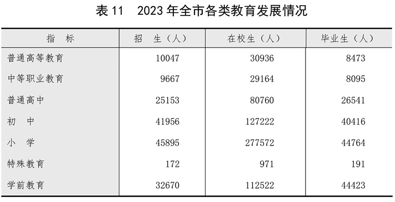 年末全市高等院校4所。全年新(改、扩)建公办幼儿园10所,认定普惠性民办幼儿园47所,学前教育毛入园率达到97.15%。