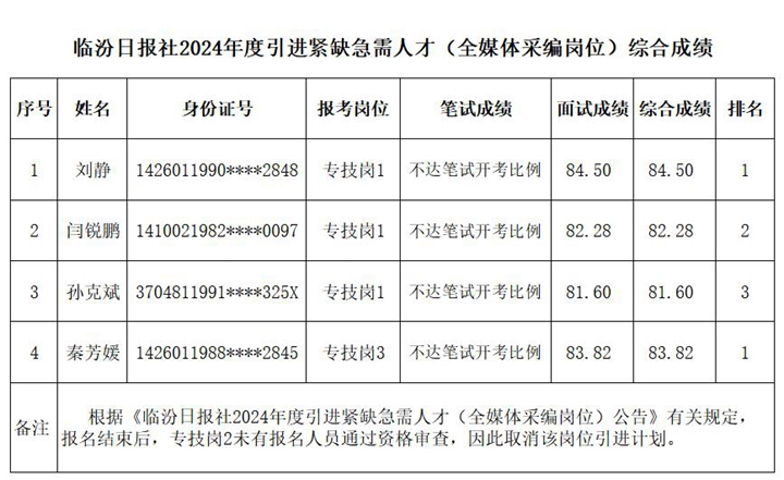 根据《临汾日报社2024年度引进紧缺急需人才(全媒体采编岗位)公告》,现将临汾日报社2024年度引进紧缺急需人才(全媒体采编岗位)考试综合成绩予以公告。