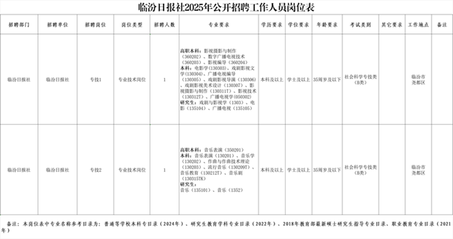 今天,山西省人力资源和社会保障厅官网公布了《山西省2025年事业单位公开招聘公告》。此次公开招聘,临汾日报社共设专技岗2个,招聘2人,事业编制。