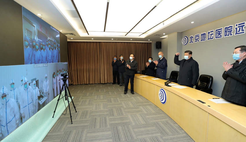 在地坛医院远程诊疗中心,习近平通过视频连线武汉市收治新冠肺炎患者的金银潭医院、协和医院、火神山医院,向疫情防控一线的医务工作者了解情况、听取意见和建议。