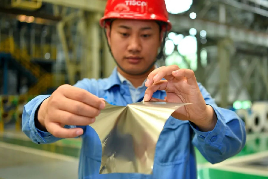 太钢集团员工展示用手撕开超薄带状不锈钢 新华社记者曹阳摄