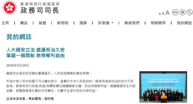 5月24日,香港政务司司长张建宗发表题为《人大国安立法 维护长治久安 巩固一国两制 无损权利自由》的文章。文章称,国家安全是安邦定国的重要基石、人民安居乐业的最佳保障,香港特别行政区(特区)有宪制责任维护国家主权、安全和发展利益。这不仅是整个香港社会的共同责任,也关乎全港市民的切身利益。