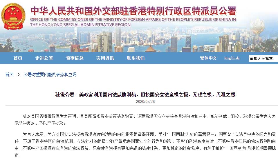 针对美国务卿蓬佩奥发表声明,拿美所谓《香港政策法》说事,诬蔑香港国安立法损害香港自治和自由,威胁制裁、阻挠,驻港公署发言人表示坚决反对,予以严正批驳。