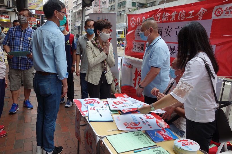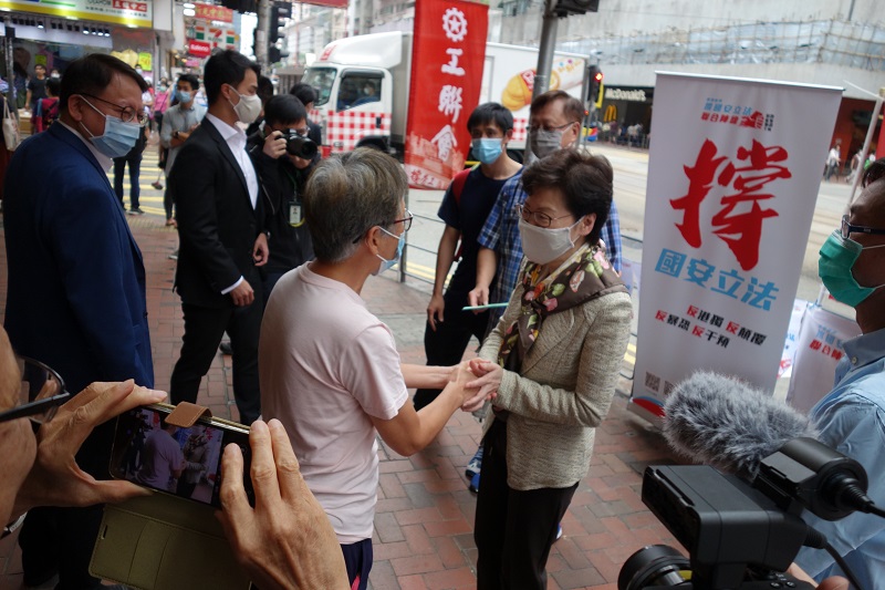 “香港各界撑国安立法联合阵线”近日发起联署行动,在网上及香港市区收集市民签名,支持全国人大对香港维护国家安全立法。香港特区行政长官林郑月娥28日中午赴北角的一个市区站点签名,力撑相关活动。