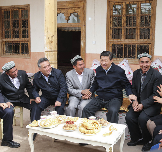 2014年4月27日至30日,中共中央总书记、国家主席、中央军委主席习近平在新疆考察。这是4月28日上午,习近平在疏附县托克扎克镇阿亚格曼干村村民阿卜都克尤木·肉孜家同村民座谈。新华社记者 兰红光 摄