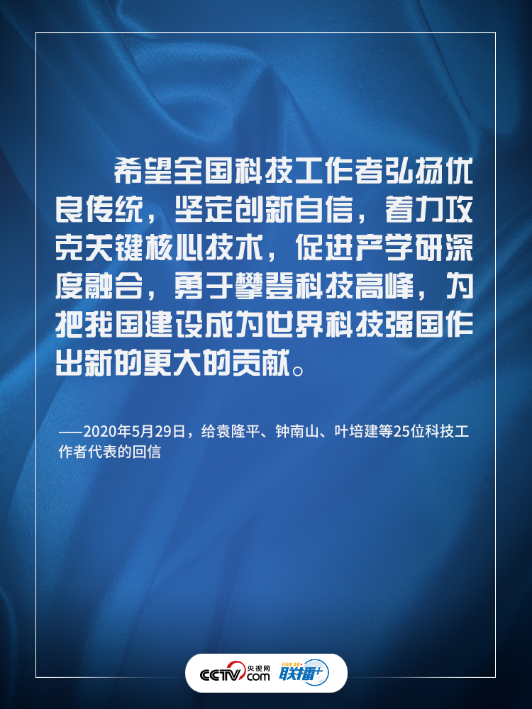 联播+“创新是引领发展的第一动力,科技是战胜困难的有力武器。”在“全国科技工作者日”到来之际,习近平总书记给袁隆平、钟南山、叶培建等25位科技工作者代表回信。在信中,他肯定了全国科技工作者迎难而上、攻坚克难,为疫情防控斗争提供了科技支撑,并希望全国科技工作者“为把我国建设成为世界科技强国作出新的更大的贡献”。