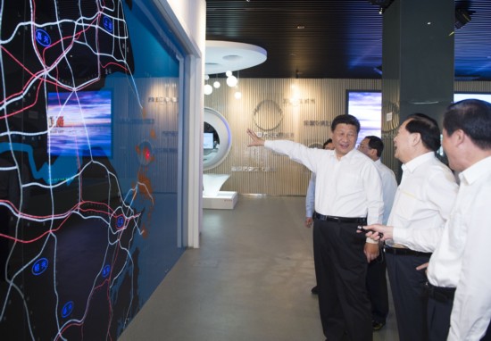 2015年5月25日中午,习近平来到浙江舟山。这是习近平在浙江舟山群岛新区城市展示馆,观看反映舟山近年经济社会发展的图片、沙盘和视频短片,向省、市负责同志详细了解有关情况。(新华社记者 谢环驰 摄)
