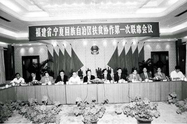 1996年11月,闽宁扶贫协作第一次联席会议在福建召开。图为习近平(右五)出席闽宁扶贫协作第一次联席会议。