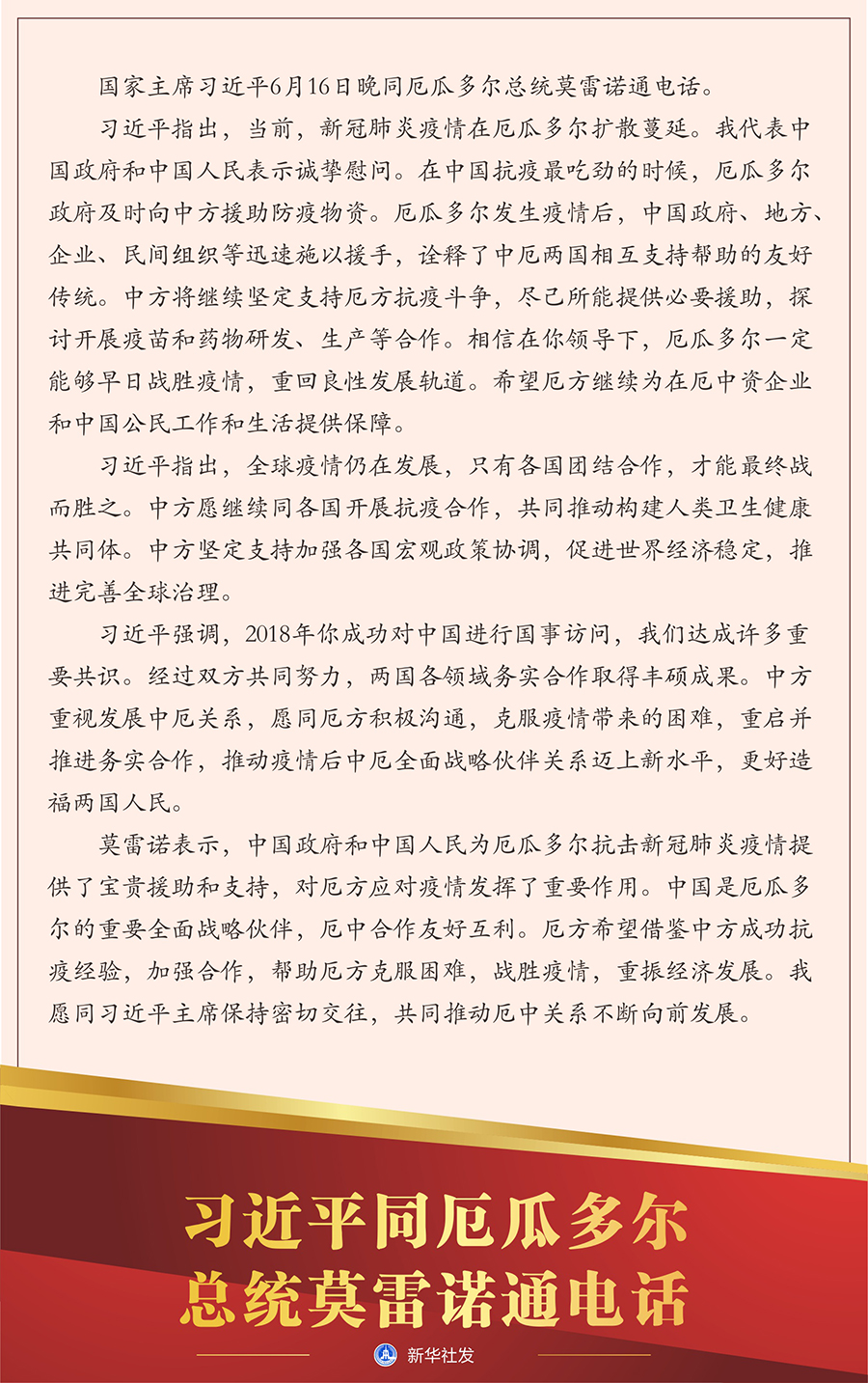 新华社北京6月16日电 国家主席习近平6月16日晚同厄瓜多尔总统莫雷诺通电话。