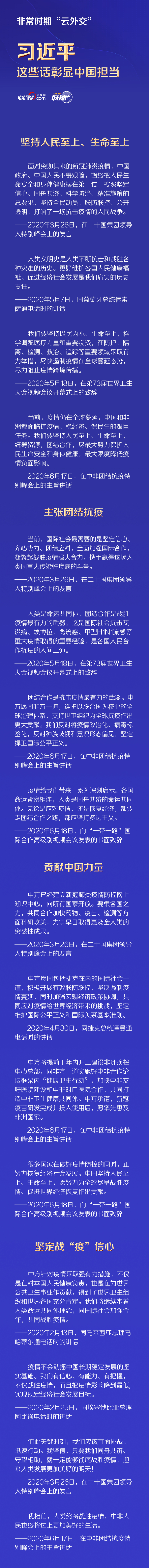截至目前,习近平主席已经同数十位外国领导人及国际组织负责人通话或见面,出席二十国集团领导人应对新冠肺炎特别峰会,在第73届世界卫生大会视频会议开幕式上致辞,主持中非团结抗疫特别峰会并发表主旨讲话等,开启了以电话、书信、视频为主渠道的“云外交”模式。