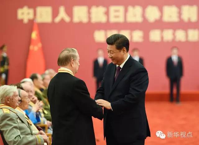 2015年9月2日,习近平在北京人民大会堂向30名抗战老战士老同志、抗战将领、帮助和支持中国抗战的国际友人或其遗属代表颁发中国人民抗日战争胜利70周年纪念章并发表重要讲话。新华社记者 谢环驰摄