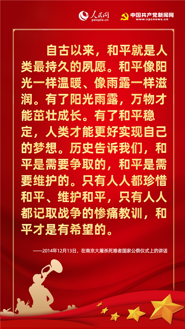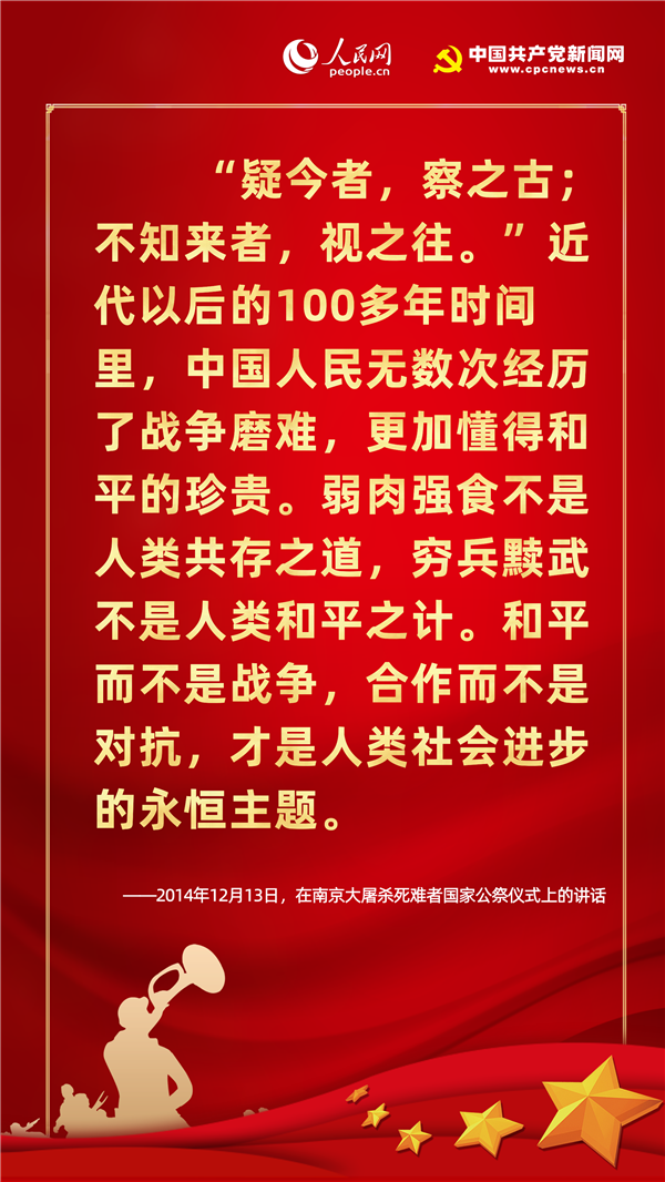 历史不仅关乎过去,更关乎现在和未来。纪念历史不是为了咀嚼苦难、延续仇恨,而是为了重申和平与正义的价值,从历史中汲取智慧,获得开创未来的精神力量。在七七事变83周年的今天,人民网·中国共产党新闻网梳理十八大以来习近平总书记有关“战争与和平”的重要论述,让我们一起“铭记历史、缅怀先烈、珍视和平、警示未来”。