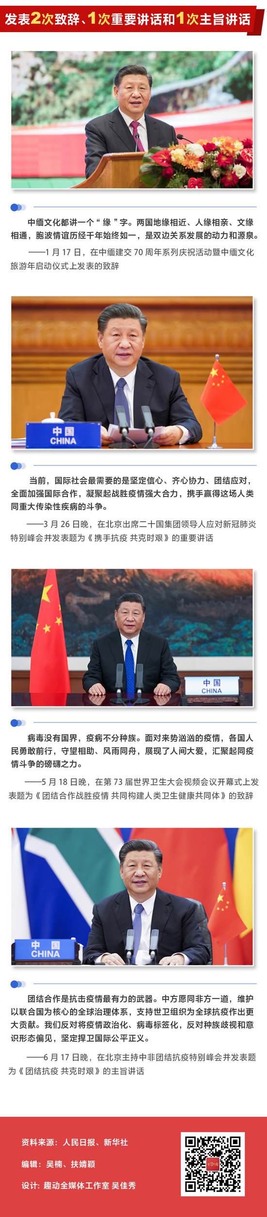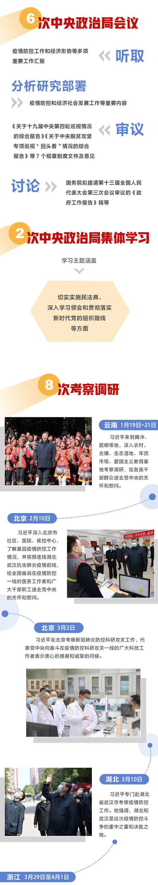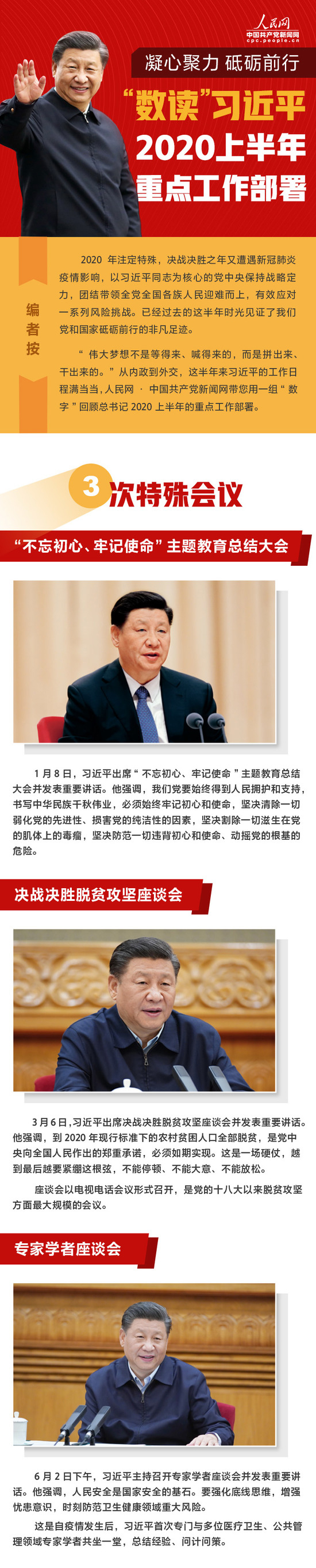 细数今年上半年,习近平夙夜在公,勤勉工作,不断刷新“忙碌指数”:数十次出席重要会议部署各项工作,8次国内考察,调研足迹遍及7省区市,3次出席国际重要会议并发表讲话,20余次致信、回信海内外人士,60次就疫情防控等话题与40余位外国政要和国际组织负责人通电话……人民网·中国共产党新闻网推出系列图解报道,带您全方面回顾习近平的2020上半年。