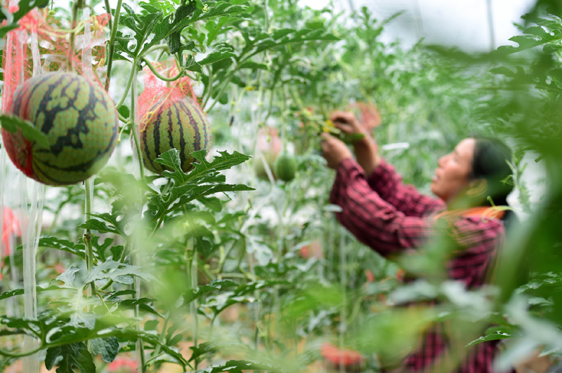 ▲5月7日,在河北省石家庄市灵寿县三圣院乡木佛庄园有机蔬菜种植基地,农户在管护大棚西瓜。