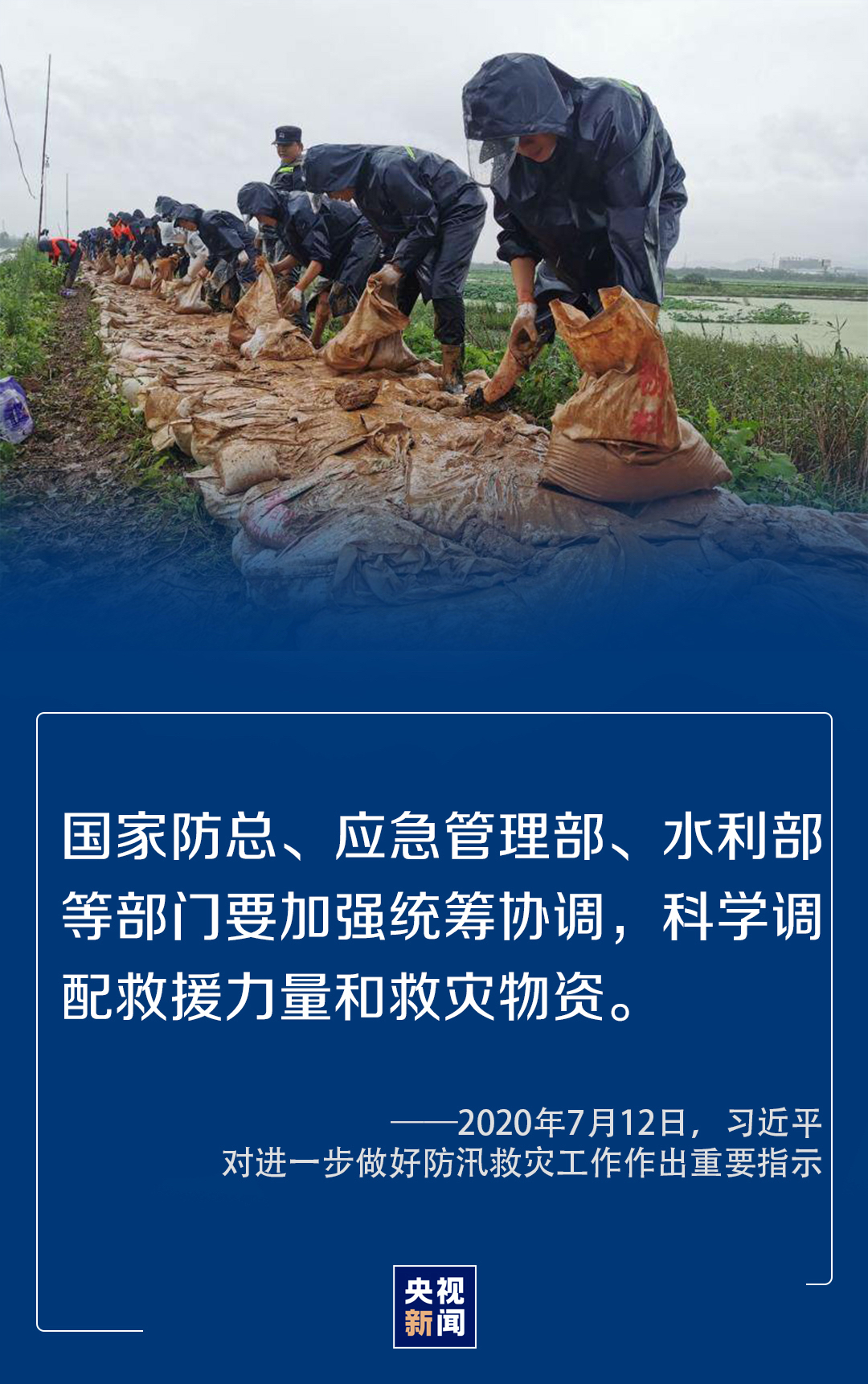 7月12日,习近平对进一步做好防汛救灾工作作出重要指示指出,各级党委和政府要压实责任、勇于担当,各级领导干部要深入一线、靠前指挥,组织广大干部群众,采取更加有力有效的措施,切实做好监测预警、堤库排查、应急处置、受灾群众安置等各项工作,全力抢险救援,尽最大努力保障人民群众生命财产安全。