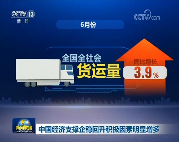 全社会货运量6月同比增长3.9%,增速比上月加快3.5个百分点。全国铁路货运量和港口货物吞吐量增速均为今年以来月度最高。