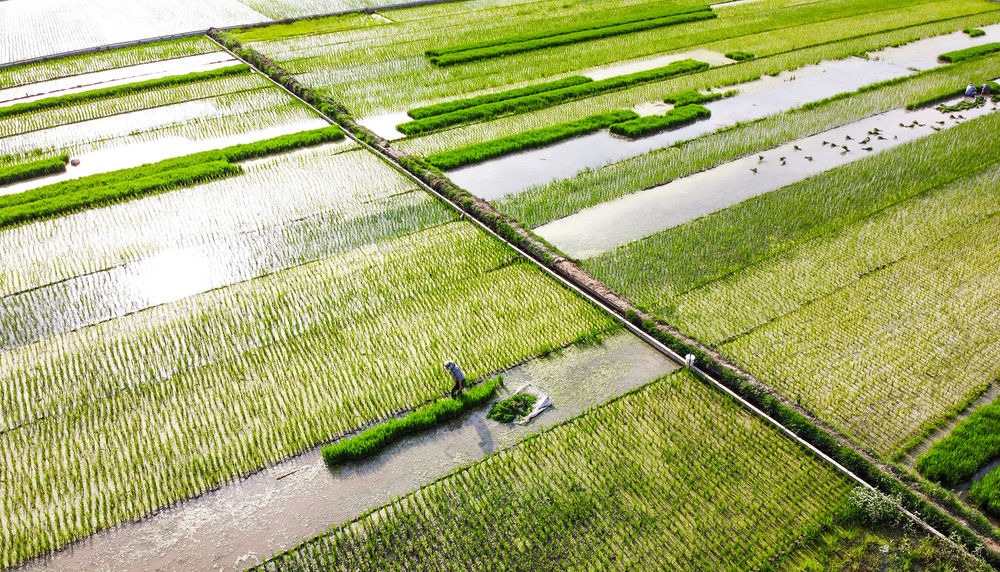 2020年6月14日,农民在洛阳市孟津县会盟镇黄河岸边的万亩优质水稻种植示范基地内移栽水稻秧苗(无人机照片)。新华社发(黄政伟 摄)