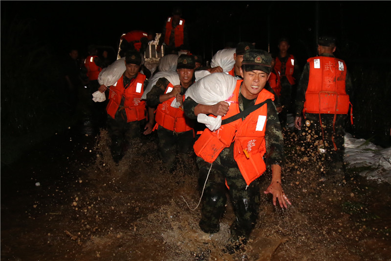 ▲ 2020年7月8日凌晨,武警江西省总队景德镇支队官兵在景德镇市珠山区观音阁地区搬运沙袋加固昌江堤坝。
