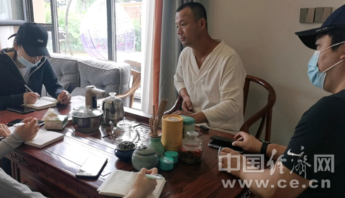 图为义勒力特镇远方廷院民宿负责人陈爱平(中)在接受记者采访。(经济日报-中国经济网记者 武晓娟/摄)