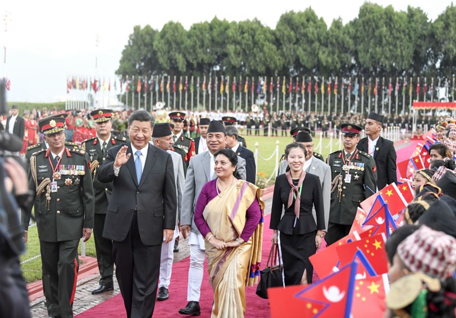 2019年10月12日,国家主席习近平乘专机抵达加德满都,开始对尼泊尔进行国事访问。尼泊尔总统班达里在机场为习近平举行具有浓郁尼泊尔民族特色的欢迎仪式。新华社记者 高洁 摄
