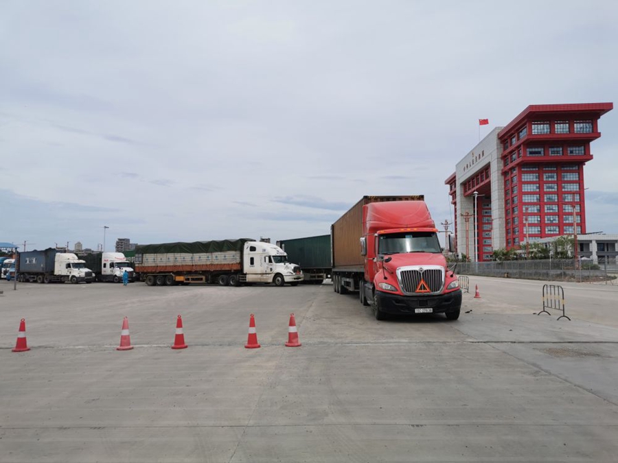 2020年6月8日,在广西东兴口岸,一批越南货车在排队候检,准备通关。 新华社发(林珉正 摄)