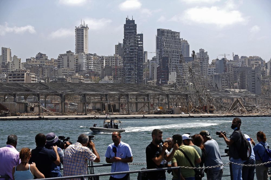2020年8月8日,媒体记者在被炸毁的黎巴嫩贝鲁特港口区采访。贝鲁特港口区4日傍晚发生剧烈爆炸,迄今爆炸已造成158人死亡、6000多人受伤,另有数十人下落不明。爆炸还造成约30万民众无家可归。 新华社发(比拉尔·贾维希 摄)
