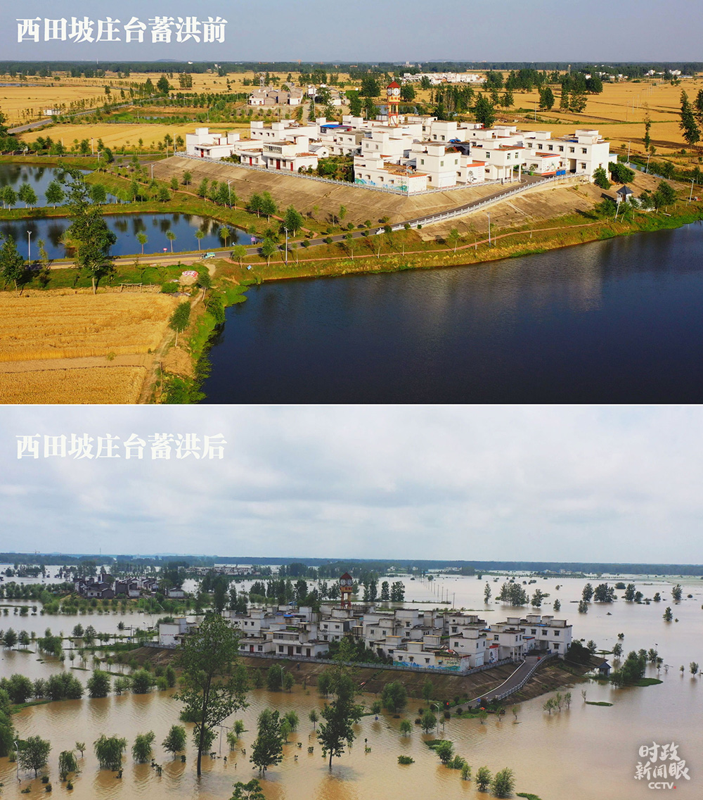 △这是蓄洪前后的庄台对比图。庄台形似倒扣的盆,中间高、四周低,人居住在台子上,洪水从四周流过。(资料图)