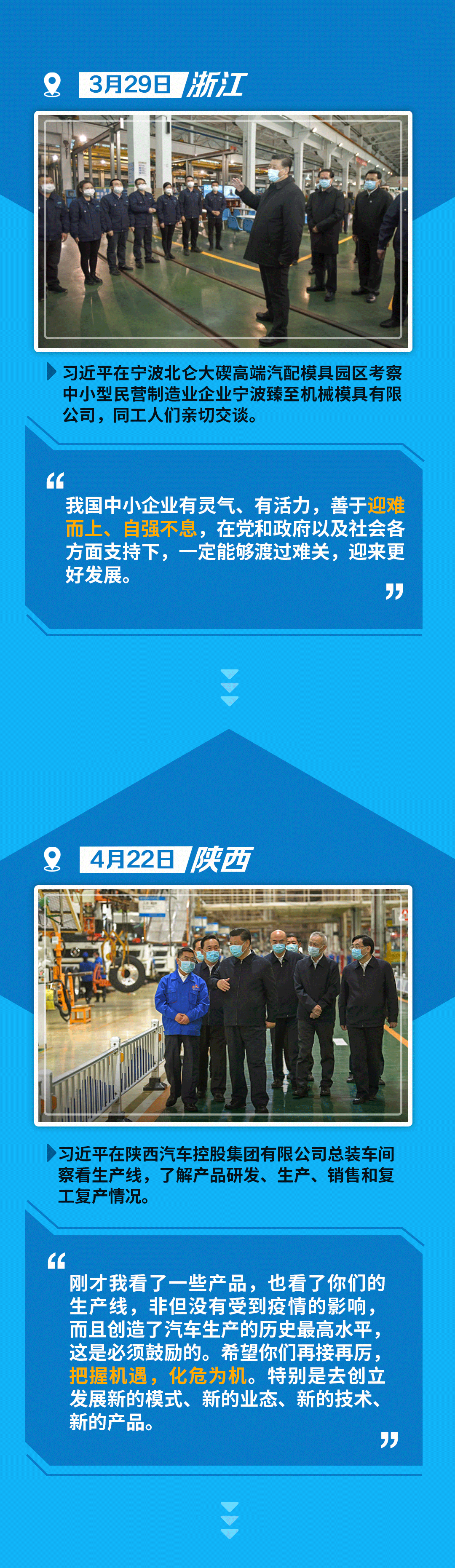 今年3月底,习近平到浙江考察的第一天,便来到宁波北仑大碶高端汽配模具园区的中小型民营企业生产车间。在接下来的地方考察中,陕西汽车控股集团有限公司总装车间、山西太钢不锈钢精密带钢有限公司生产车间、吉林长春一汽集团研发总院……习近平频频走进企业生产、研发一线。
