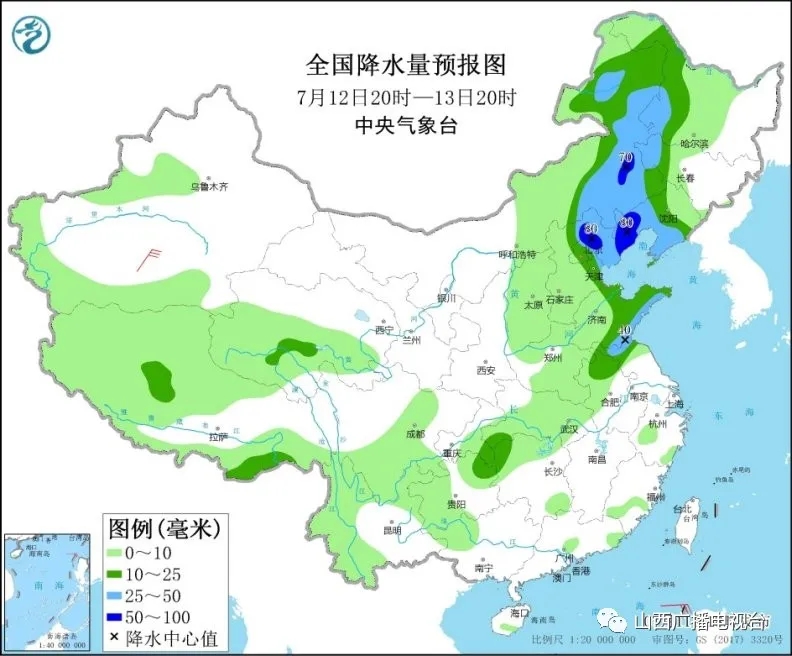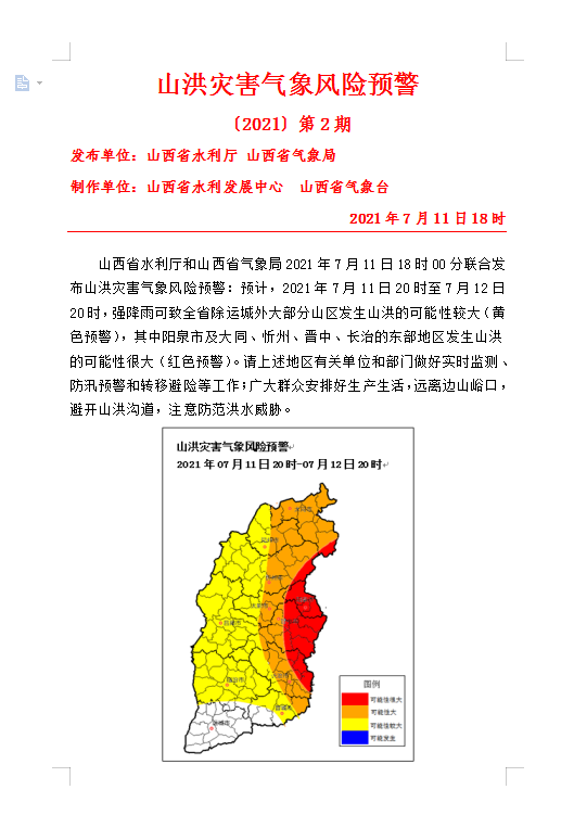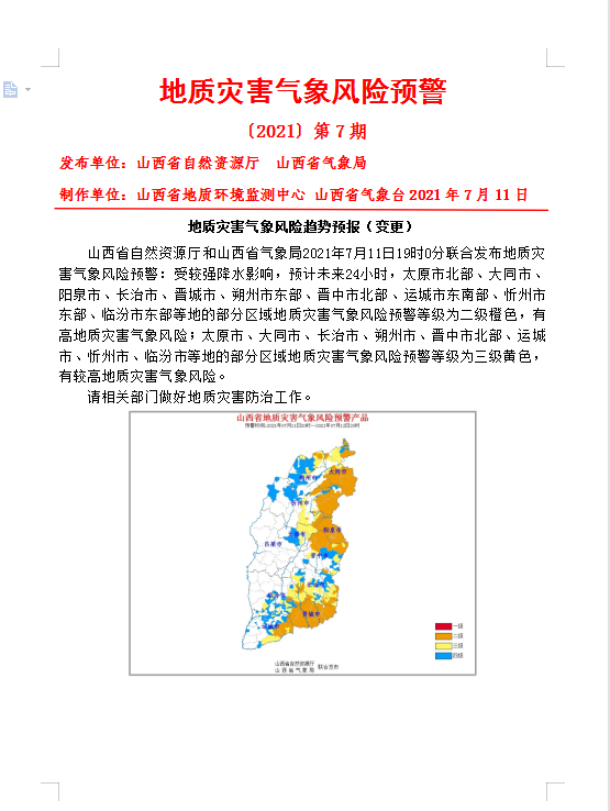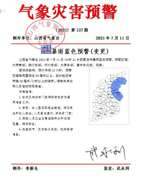 山西省气象台2021年7月11日18时21分变更发布暴雨蓝色预警,预警区域:大同南部、朔州东部、忻州东部、太原东部、晋中东北部、阳泉。受低涡影响,预计未来12小时,预警区域降雨量将达50毫米以上,部分地区有雨强30毫米/小时以上的降雨。请有关单位和人员做好防范准备。