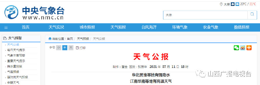 今天白天,山西南部、河北南部、河南北部、四川东北部、重庆西部和北部等地的部分地区出现大到暴雨,山西东南部、河南西北部等局地大暴雨到特大暴雨;江南及山东中北部、安徽北部等地出现35~38℃高温天气。