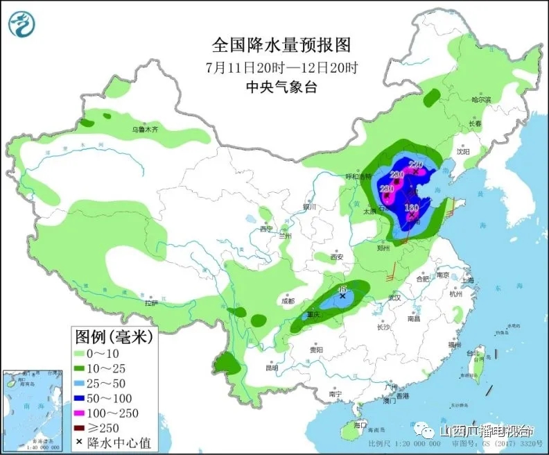 7月11日20时至12日20时,华北中东部、黄淮北部有大到暴雨,部分地区有大暴雨或特大暴雨(250~280毫米);湖北西南部、重庆大部等地有中到大雨。华北中东部、黄淮大部等地有4~6级风(见图3)。